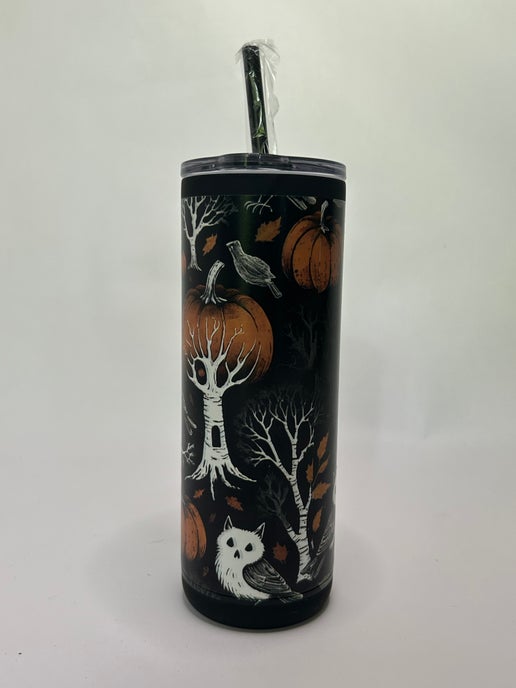 This hauntingly beautiful tumbler is ready for any season. Designed by TheMeridianbyKells. This 20-oz tumbler comes with a reusable straw and is made of stainless steel. Pumpkins and ghouls playfully dance around the cup.